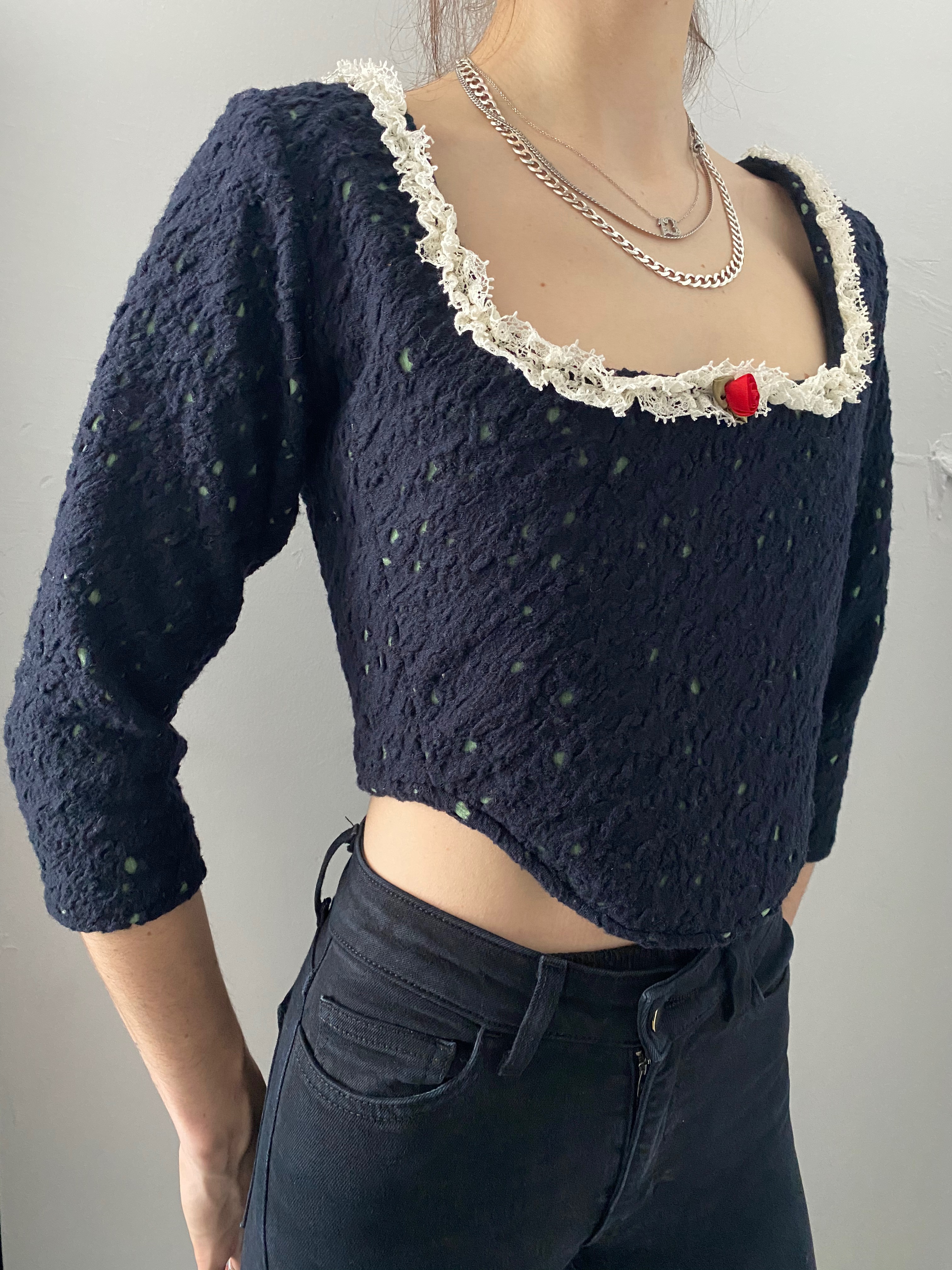 Handmade long sleeved (3/4 sleeve) corset made of deadstock navy wool w/ olive underlay